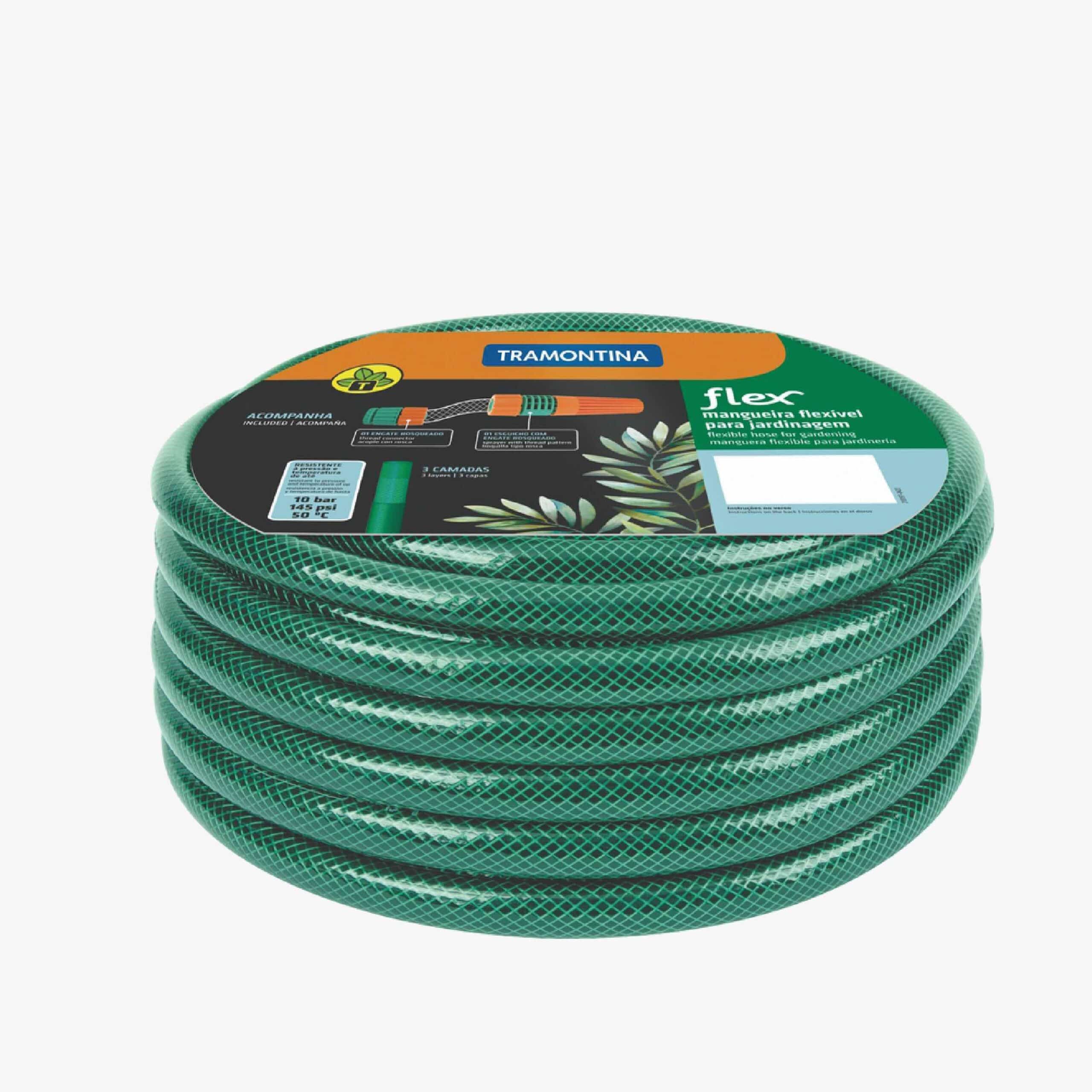 خرطوم حديقة مرن من ترامونتينا بطول 15 مترًا باللون الأخضر، مزود بثلاث طبقات من ألياف البولي فينيل كلوريد وحبل بوليستر مضفر مع موصلات خيطية وجهاز رش