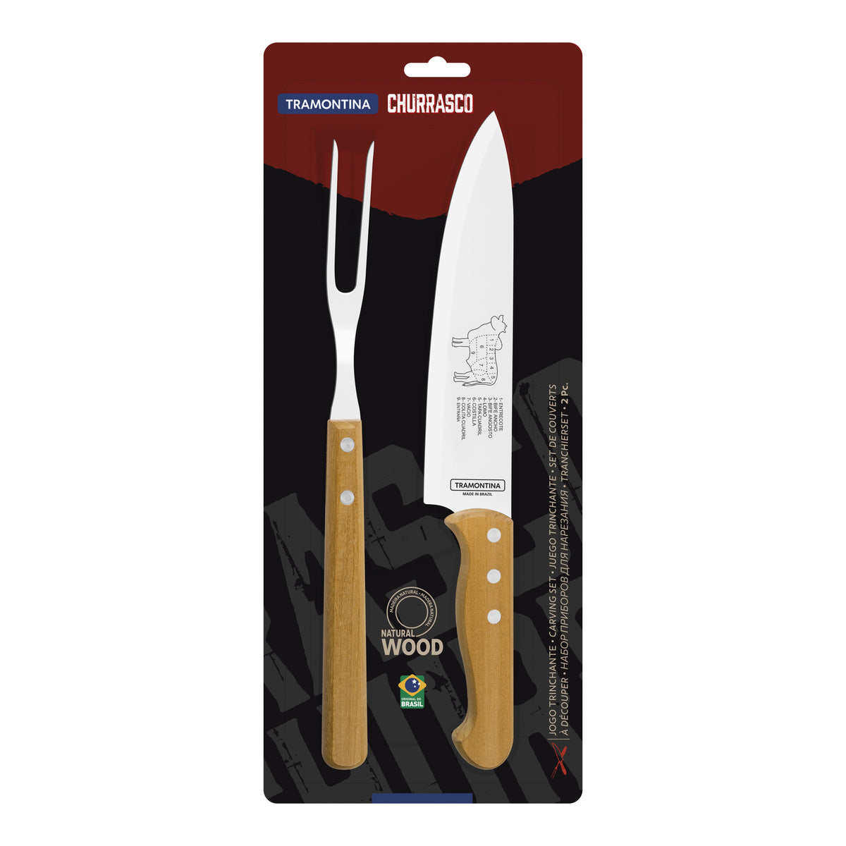 Your barbecue at home has never been more complete. With Tramontina's 2-piece carving set stainless-steel blades and natural wooden handles, serving your guests will be even easier and tastier! The carving knife and fork are made of highly durable stainless steel blades and both have unique features. The 8" knife has a long-lasting cutting edge due to the thermal treatment it receives and the fork is thicker and receives steel stamping for greater resistance. These are two special products that add beauty to your service. With their natural wooden handles, they add comfort and well-being to the moment of serving the barbecue.