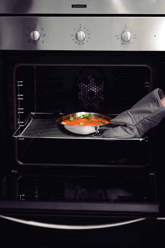 Are you looking for practicality and versatility in your kitchen? Then discover the Tramontina Grano parchment frying pan in stainless steel with a tri-ply body measuring 30 centimeters in diameter, unpackaged. With it, you have an item with a modern and distinctive design, suitable for use from preparation to the table. With a tri-ply body made of stainless steel, aluminum, and stainless steel, it ensures fast cooking and is extremely easy to clean, thanks to its corner-free design. Its high-gloss finish is perfect for finishing dishes and browning in the oven, withstanding a maximum temperature of 260°C (500°F). Furthermore, it is dishwasher safe and compatible with various types of stovetops, including gas, electric, glass ceramic, and induction. Choose Tramontina for a much more practical and high-quality routine!