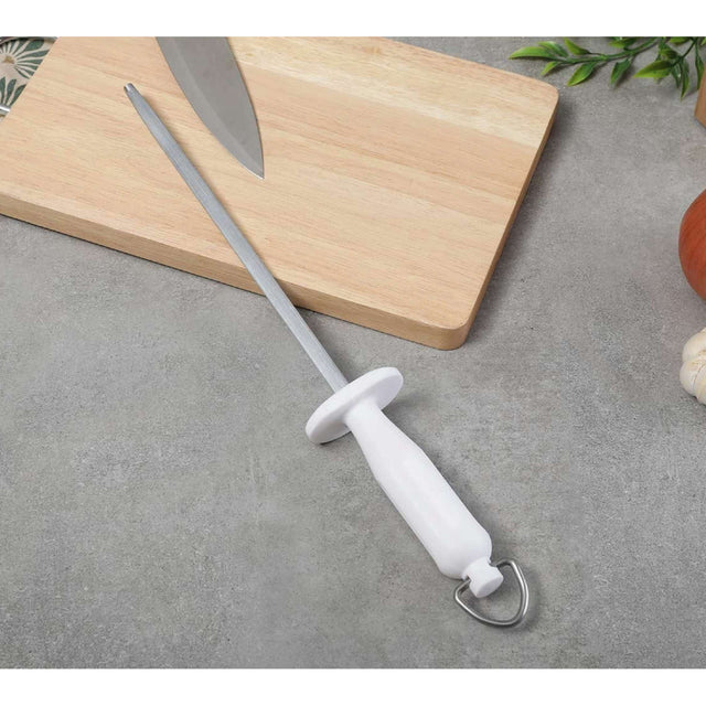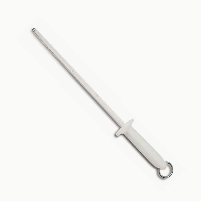 When sharpening your knives, use Tramontina Professional 12-inch Grooved Sharpener with carbon steel rod and white polypropylene handle and enjoy much more performance and quality in your knives cutting edge. The sharpener has a 12-inch hard-chrome coated carbon steel rod. For improved comfort, the anatomical polypropylene handle provides a perfect hand grip. Your tasks are easier with Tramontina!
