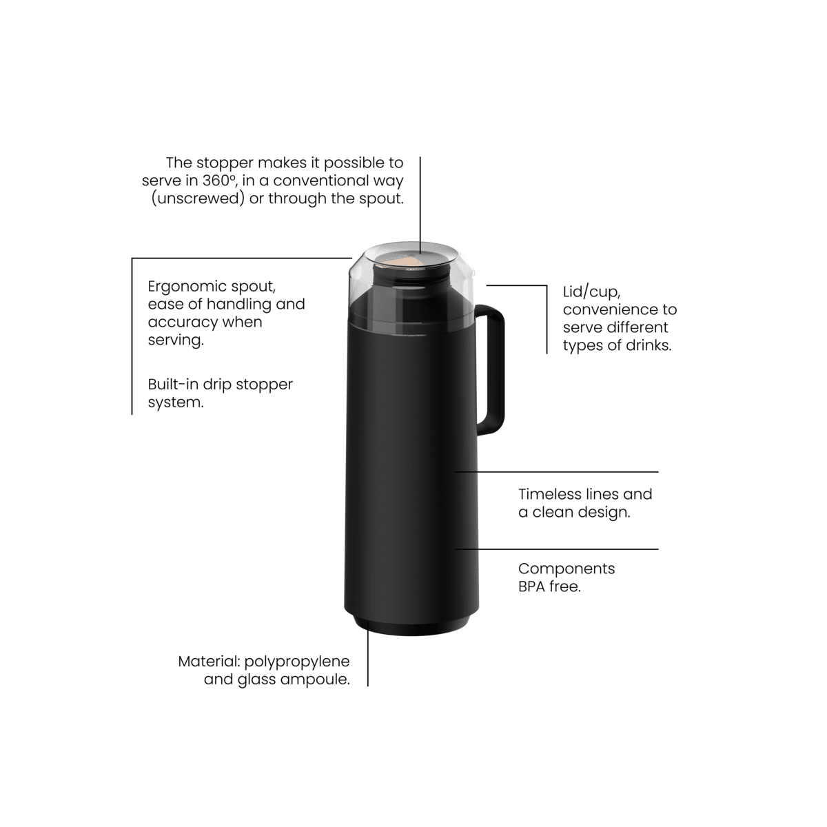 | الوظائف والفوائد الرئيسية | بفضل خطوطها الخالدة وتصميمها النظيف، فإن وعاء الهواء الحراري في خط Exata يتناسب جيدًا مع أي نمط ومساحة. مثالي للحفاظ على السوائل الساخنة أو الباردة في درجة الحرارة المناسبة لفترة أطول. بسيطة وحديثة، وتشغل مساحة أقل في منزلك وأثناء النقل. عملي وآمن لجميع أفراد العائلة. خفيف الوزن وسهل الاستخدام. صحية وسهلة التنظيف. المكونات خالية من مادة BPA. نظام إيقاف التنقيط المدمج. فوهة مريحة، وسهولة في التعامل والدقة عند التقديم. غطاء/كوب، مناسب لتقديم أنواع مختلفة من المشروبات. يتيح السدادة إمكانية التقديم بزاوية 360 درجة، بالطريقة التقليدية (بدون براغي) أو من خلال الفوهة. المواد: البولي بروبلين وأمبولة زجاجية. |