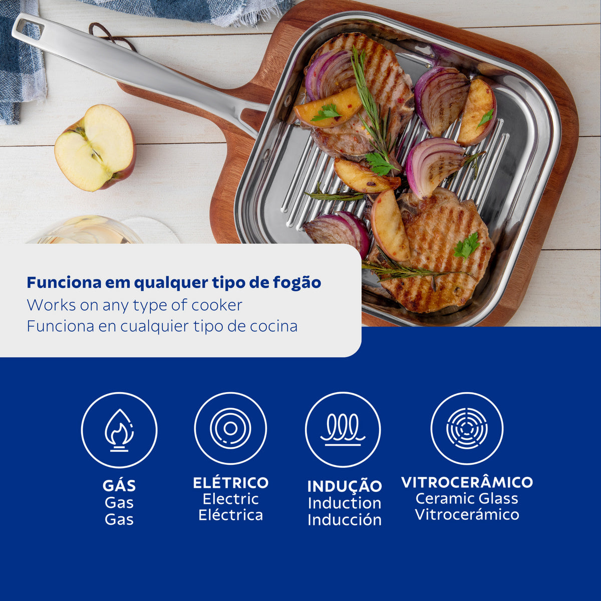Your dishes will level up with Tramontina's Grano 1.9 L stainless steel griddle pan. For versatile cooking, it is perfect for grilling your best meat, fish and vegetable dishes. It is also impressive due to its functionality. This griddle pan can go in the oven to brown or finish dishes and can be used on different types of cooktops. Made of highly durable stainless steel with tri-ply body (stainless steel + aluminum + stainless steel) technology. This characteristic distributes heat evenly for faster and more efficient cooking. It also keeps your food warm for longer. The contemporary design makes it a great choice for serving at the table. This product is also very easy to clean and dishwasher safe.