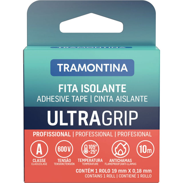 For quality electrical connections, use Tramontina's black electrical tape class A, 0.18x19 mm, 10 m. It is made of highly elastic and resistant flame-retardant material, offering perfect wire insulation for preventing electric shocks. This tape is very easy to use, making it ideal for any job!
