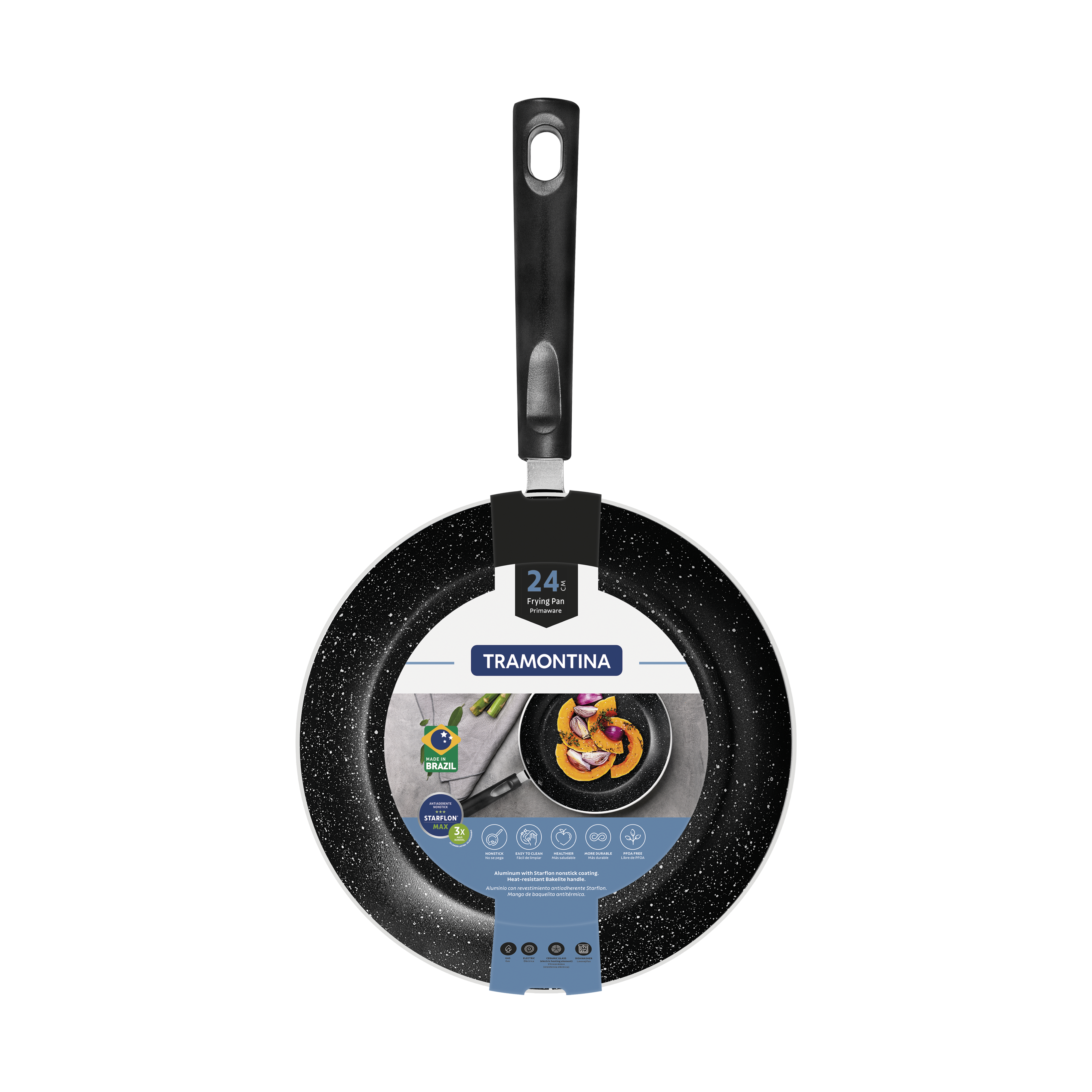 The Tramontina aluminum frying pan with interior and exterior Starflon Max nonstick coating and bakelite handle 24 centimeters in diameter 1,2-liter capacity blue provides greater quality and convenience when preparing your food. With a body made of aluminum with Starflon Max nonstick coating, attributes that provide fast and uniform cooking of food, greater durability, prevents food from sticking to its surface and makes it easier to clean. Its heat-resistant bakelite handle ensures safety and comfort in handling, as it does not get hot. In addition, it is a resistant, durable product, with the quality and design that can only be offered by Tramontina!2 mm thickness aluminum body, granting fast and even cooking. Interior and exterior Starflon Max nonstick coating is easy to clean, more durable and not harmful to health, because it's PFOA-free. Heat-resistant Bakelite handle that offers safety during handling. Dishwasher safe, facilitating your daily life. It can be used on the following stoves: gas, electric, and glass-ceramic - electric heating element.