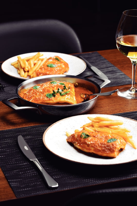 The maximum cooking capacity is 3/4 of the item's total capacity. Practicality is key with the Grano frying pan. In addition to being made with a tri-ply body, which ensures faster cooking, its corner-free design makes cleaning much easier. Made with a tri-ply body (stainless steel + aluminum + stainless steel), which ensures faster cooking, its corner-free design makes cleaning much easier. The frying pan has a modern design and a high-gloss finish, making it suitable for table use. It can be used in the oven to brown or finish dishes, at a maximum temperature of 260°C. It is dishwasher safe daily. It can be used on gas, electric, glass-ceramic, and induction stovetops.