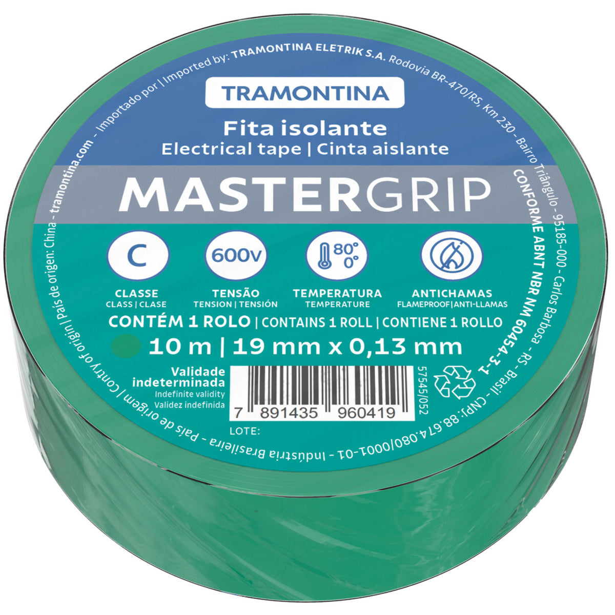 Tramontina's green electrical tape class C, 0.13x19 mm, 10 m not only provides high-quality, safe electrical connections, but also makes it easier to identify and mark electric cables. It is made of highly elastic and resistant flame-retardant material, offering perfect wire insulation fort preventing electric shocks. This tape is very easy to use, making it ideal for your electric connections!