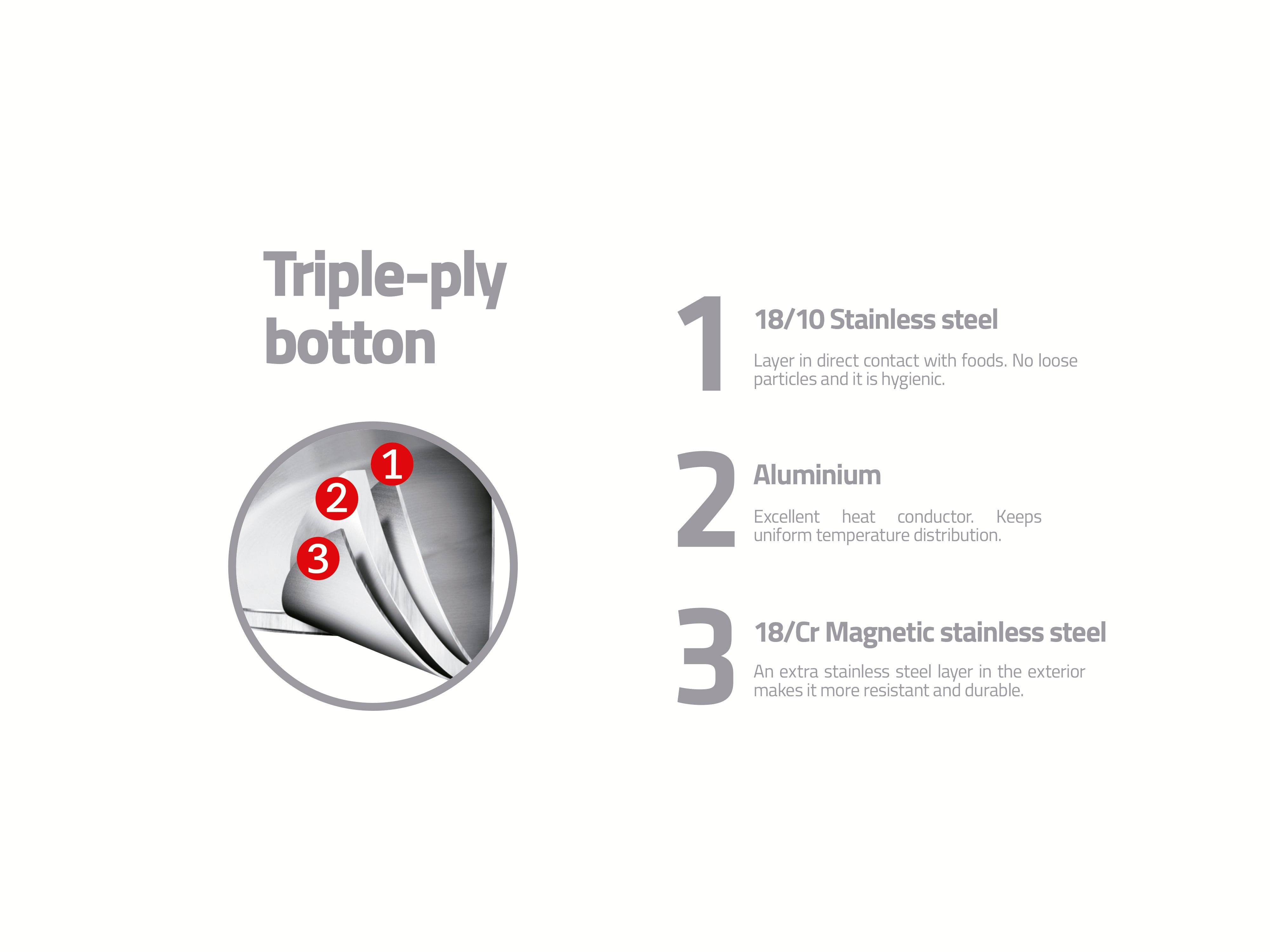 Entirely made in stainless steel, does not release any residues on food keeping it healthy. Highly durable, keeps original features preserving looks, hygiene and durability of material. Triple-ply bottom (stainless steel + aluminum + stainless steel) distributes heat evenly, resulting in faster and more uniform cooking, saving power and keeping food warm for longer. It can go in the oven to gratin or finalize dishes at a maximum temperature of 260°C. Distinctive and modern design with high gloss finish. Safe for daily dishwasher use. It can be used on gas, electric, vitroceramic glass and induction.