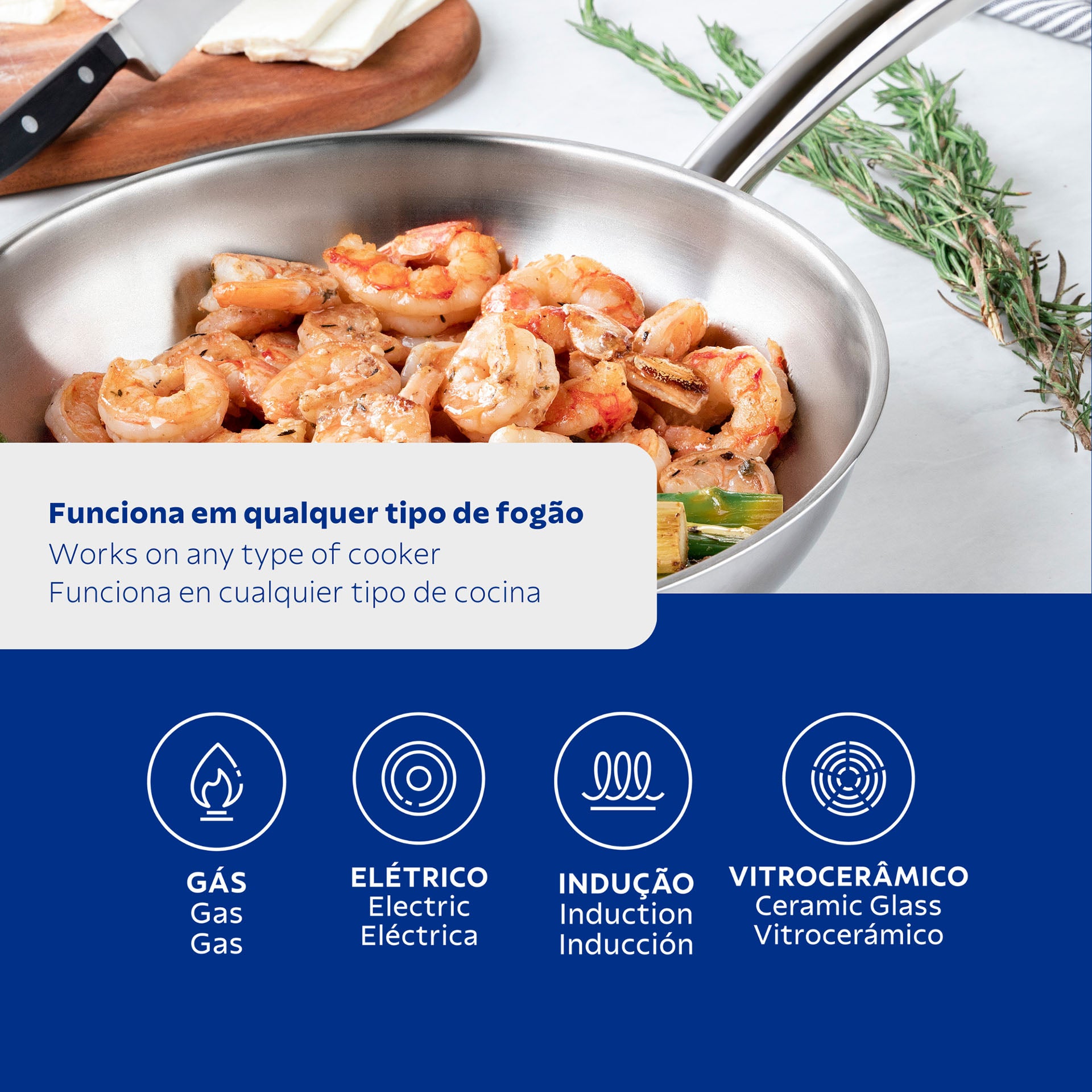 Tramontina's Una 28 cm stainless steel frying pan with tri-ply base 3.2L is the best companion for successful dishes. Made of stainless steel with tri-ply base technology (stainless steel + aluminum + stainless steel), the frying pan distributes heat evenly for faster and more uniform cooking. It is highly versatile and can be used on different types of stovetops and even in the oven to brown and finish dishes; it is resistant, durable and easy to clean. Its distinctive design with a mirror finish adds beauty to serving too. Another Tramontina product specially designed for you and your daily routine!