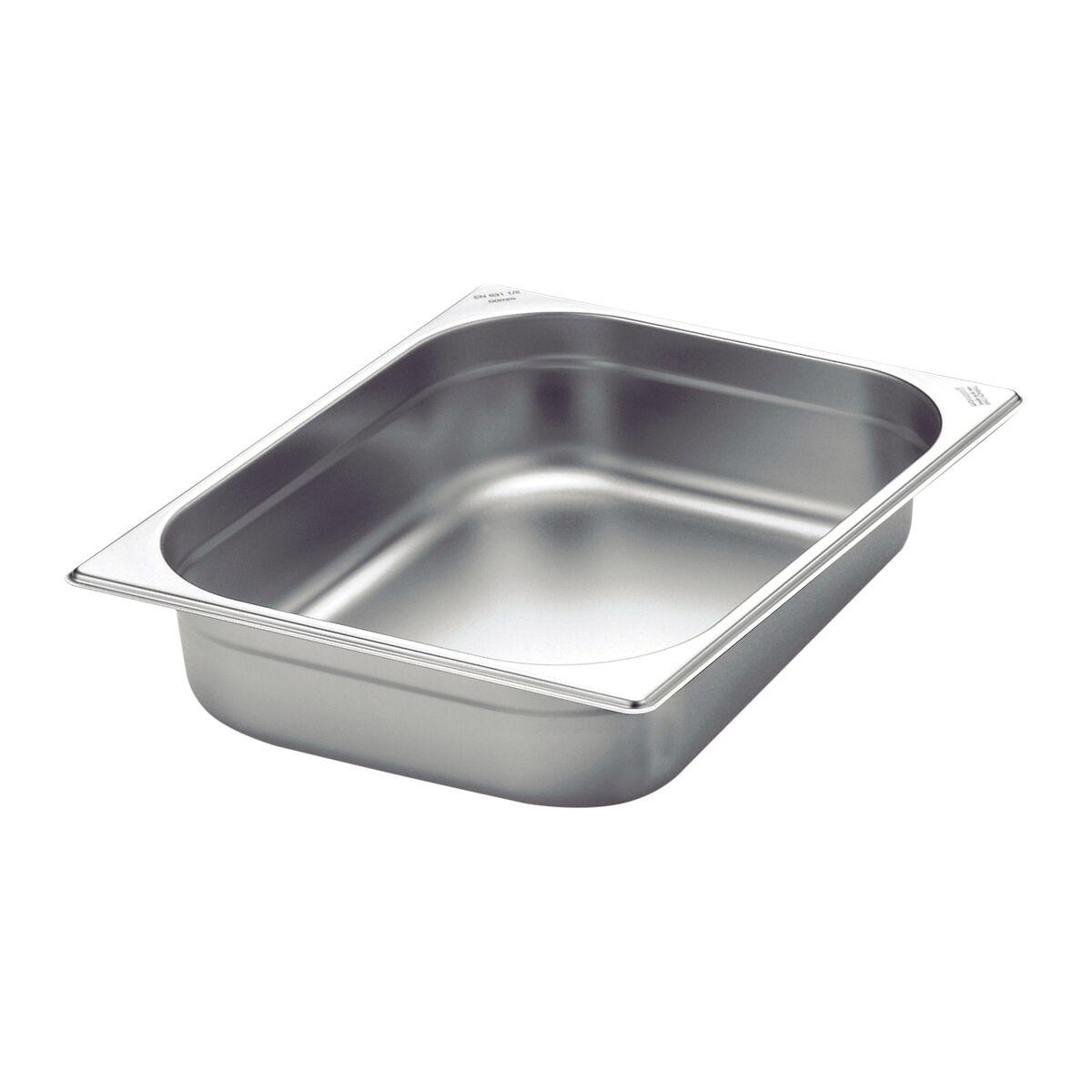 Easy to clean and to store, this food pan is perfect for your restaurant. Tramontina's 65 mm deep GN 1/2 stainless steel food pan without handles has wide, rounded corners that make it easy to clean, and low side walls that make it easily stackable.