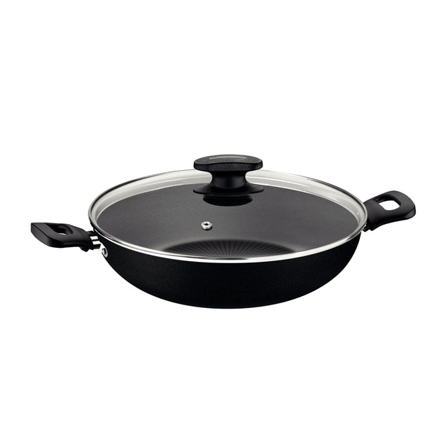 Preparing your favorite dishes is much easier with wok. Made of aluminum with interior and exterior Starflon Max non-stick coating, it has greater non-stick properties, greater scratch resistance and greater. This wok has an ultra modern and exclusively designed interior. It also features an exclusive and ultra modern interior pattern. The wok has heat-resistant Bakelite handles and a nylon knob for safer and more comfortable use, preventing burns. The tempered glass lid has a steam vent and stainless steel rim. Tramontina's wok ensures faster cooking due to its shape, and its coating allows you to cook healthier meals as it doesn't require a lot of oil, thus preserving the nutrients in your food and highlighting the original flavors.