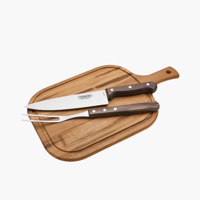If you enjoy a good barbecue and understand the importance of a good knife, the Tramontina 3-piece stainless-steel barbecue kit with brown Polywood handles and wood cutting board is the right choice to make your moments as a master grill chef even more complete. The carving knife and fork feature stainless-steel blade and tines, offering excellent results. The treated Polywood handles ensure resistance to impacts and high temperatures and a wood cutting board is included to make your get-together even better.