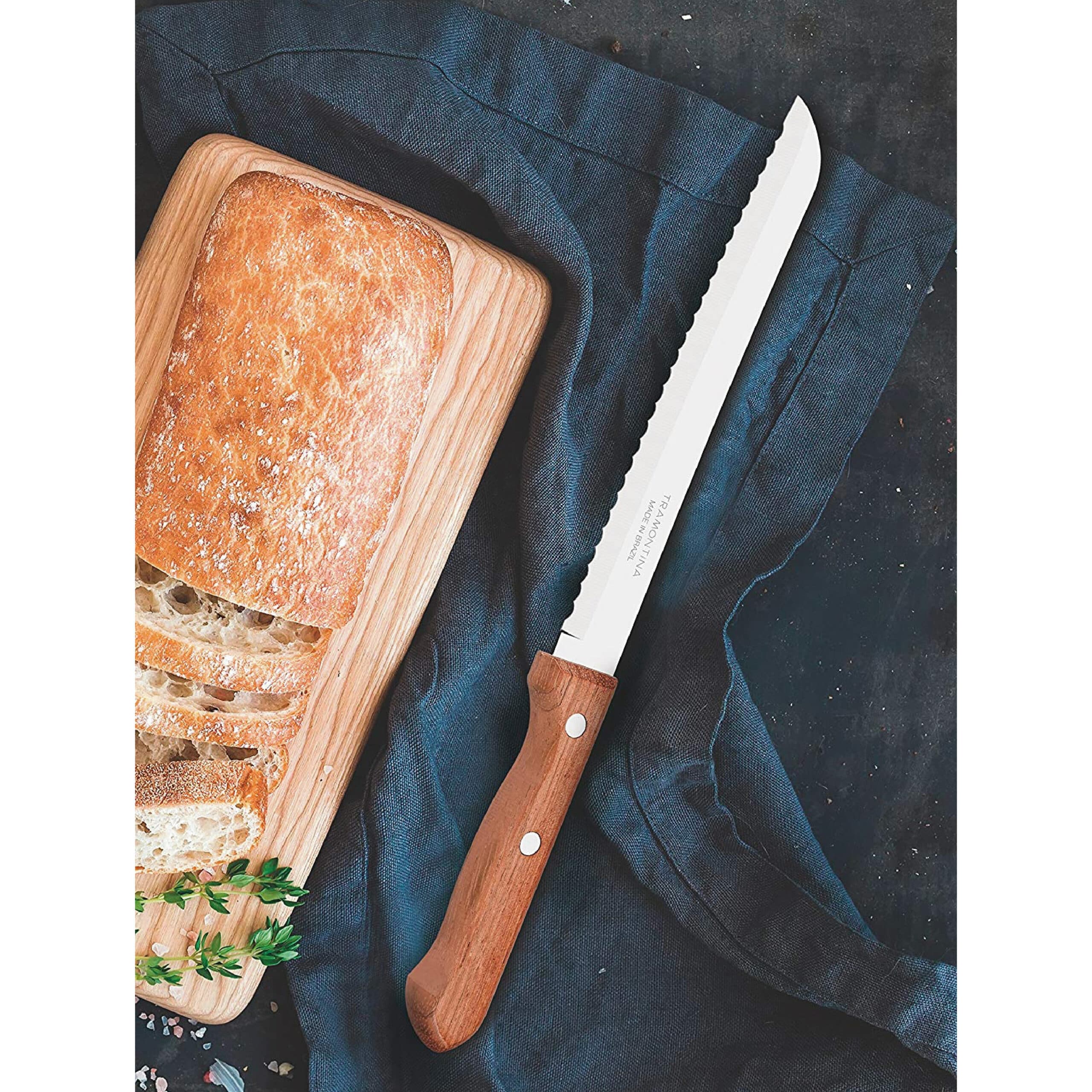 The Tramontina Dynamic 8-inch bread knife with stainless-steel blade and natural wood handle will give you more practicality for your daily breakfast. Ideal for slicing many types of bread without smashing them, it is made with a charming natural wood handle with aluminum rivets and stainless-steel blade. Due to these features, in addition to rustic style, it also provides greater strength and durability!