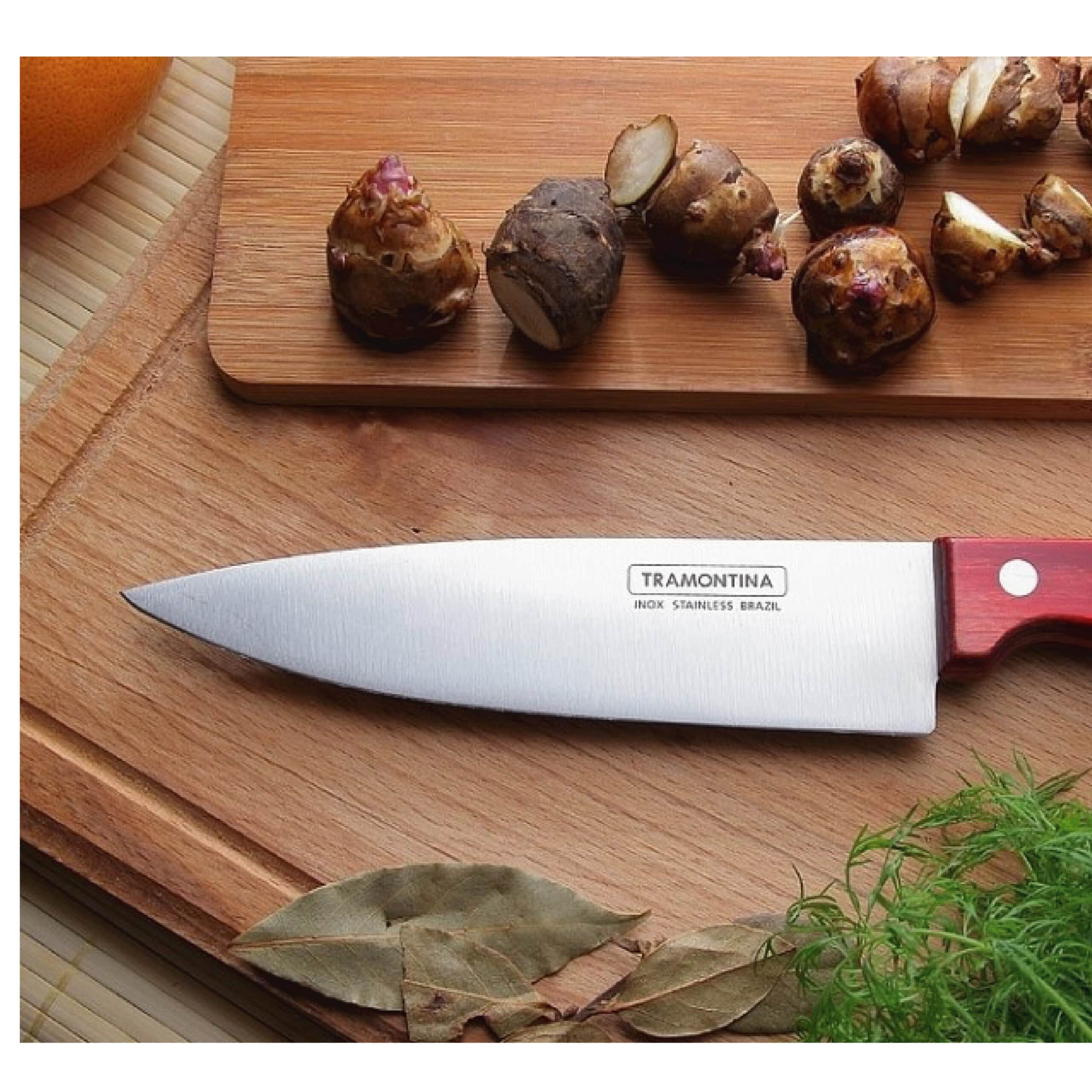 With Tramontina's 6" chef's knife with stainless steel blade and red wooden handle from the Polywood line, your kitchen routine will be even more enjoyable. Ideal for cutting various types of food, Tramontina's knife has a heat-treated stainless steel blade which ensures resistance, quality and precise cutting. In addition, the treated Polywood handle offers resistance to shock and high temperatures, comfortable handling, beauty and all the durability that only Tramontina can deliver.