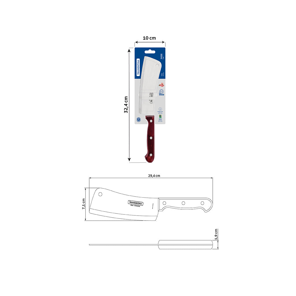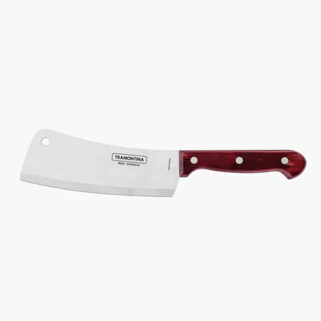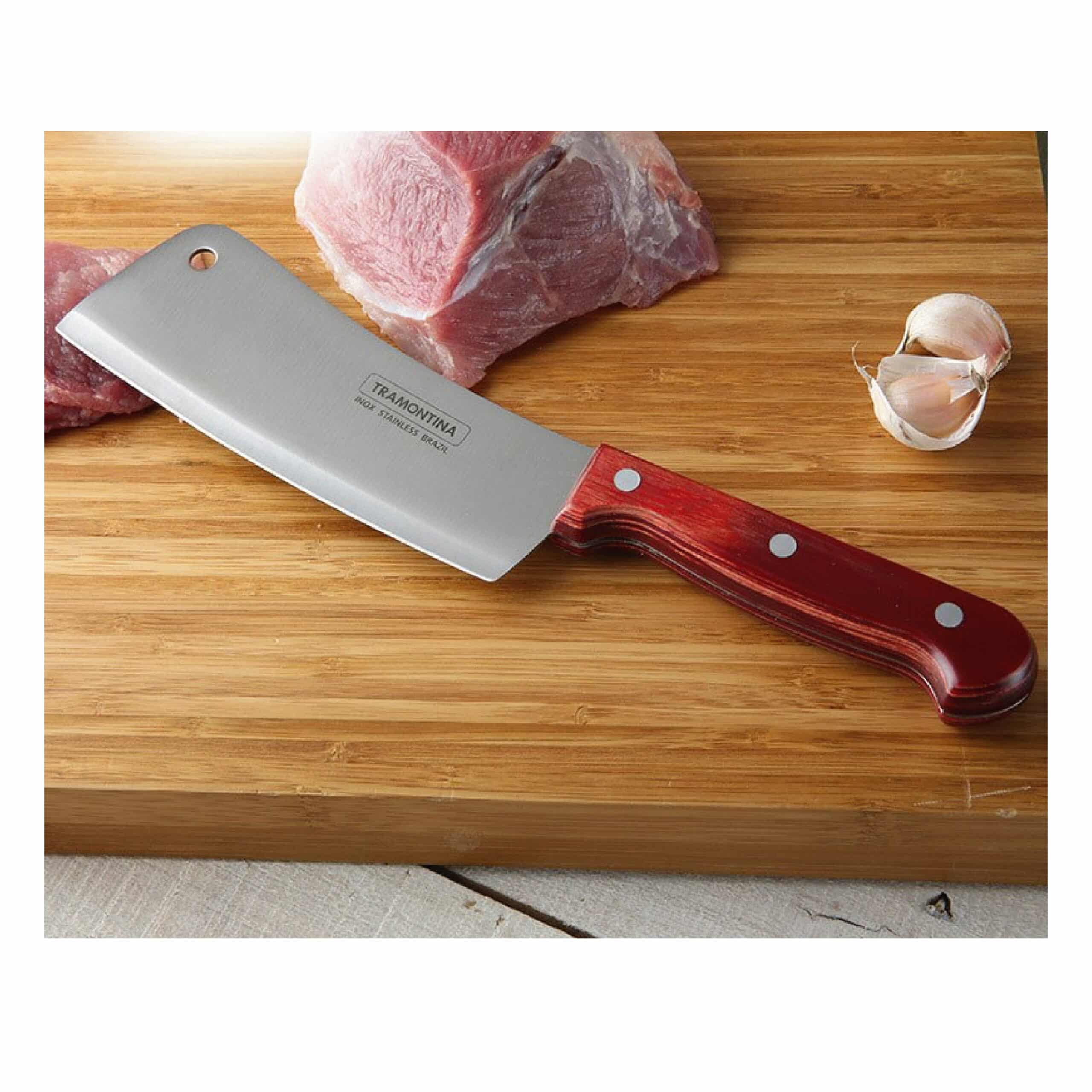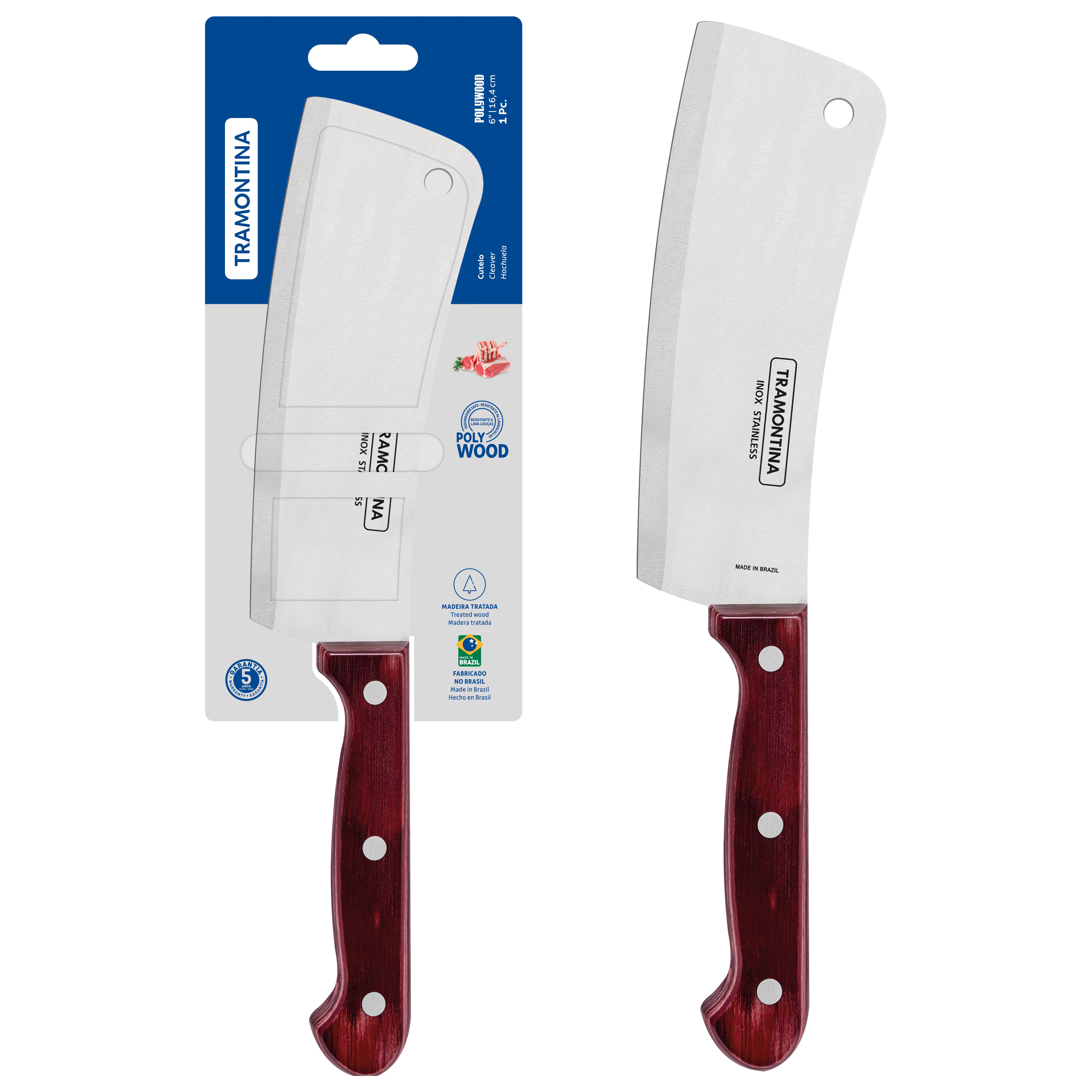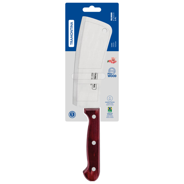 Tramontina Polywood 6-inch cleaver with stainless-steel blade and red treated wood handle is ideal to easily cut meat and bones. Essential to assist on the hardest tasks in the kitchen, it has a stainless-steel blade with shape and thickness that ensure resistance and durability, and it is also heat treated, which provides excellent cutting power. The cleaver is produced with a treated Polywood handle, that is, it is highly durable and resistant to impacts and high temperatures, and it is also dishwasher safe! Choose Tramontina and have quality items that will make your kitchen routine easier!