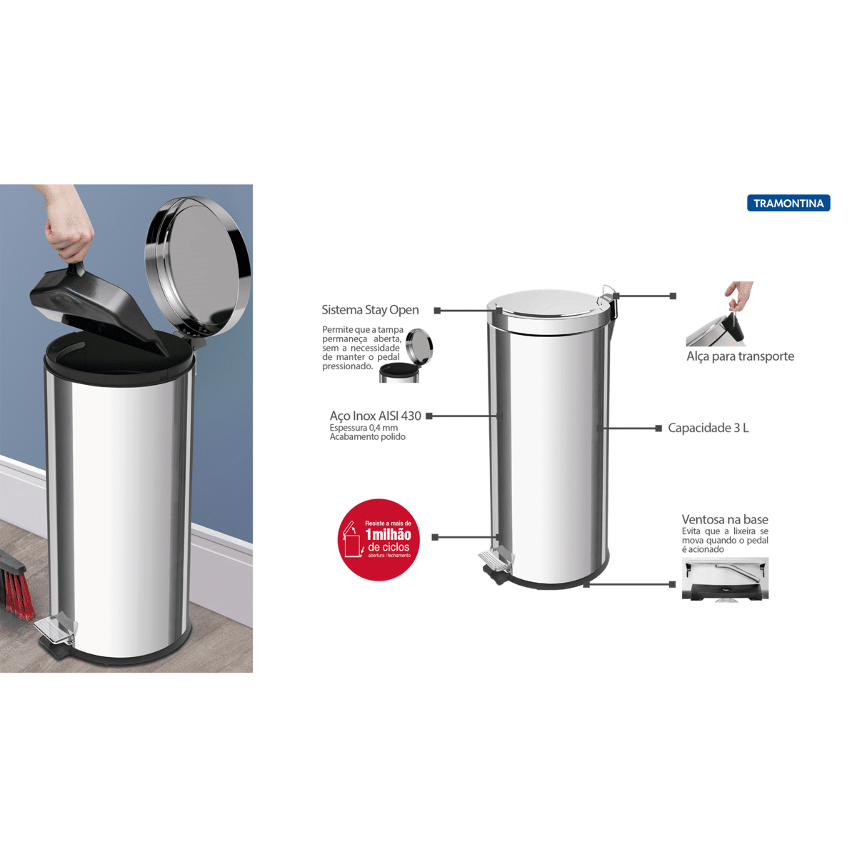 There are products that make your daily routine easier. Tramontina's 30L stainless steel pedal trash bin with a polished finish and removable internal bucket is one of them. Made in Brazil, it has a 30L capacity and is ideal for daily tasks. Made in polished stainless steel, featuring a relief on the lid for a more resistant product. The pedal opening system withstands over 1 million cycles of use (opening and closing). It includes a removable internal bucket, handle for transportation, and suction cup on the base to prevent the product from moving when being used. An essential daily use item.