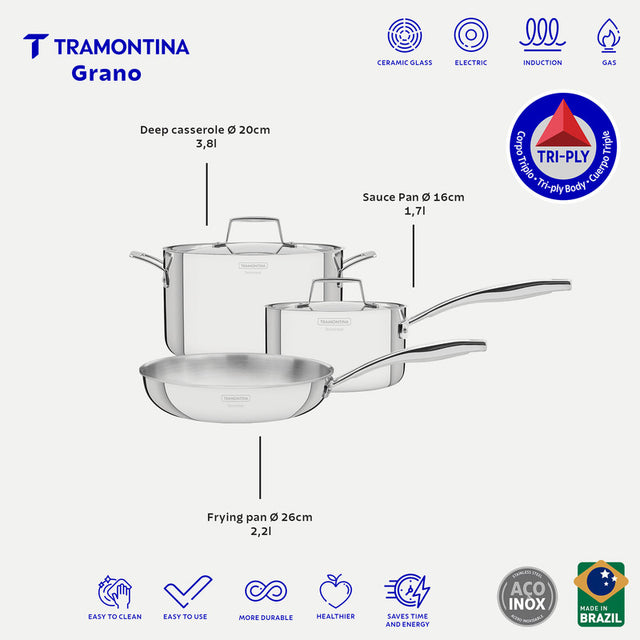 Tramontina's Grano 5-piece stainless steel cookware set with tri-ply body will make your cooking experience even more special! Its pieces are made of stainless steel with a tri-ply body (stainless steel + aluminum + stainless steel), a feature that helps distribute heat evenly and ensures faster cooking. They feature a modern design with a glossy finish and a lid with a steam vent, making food preparation easier and more convenient. Furthermore, they are highly resistant and durable, easy to clean, and dishwasher safe every day. The ideal choice to make meal preparation even better!