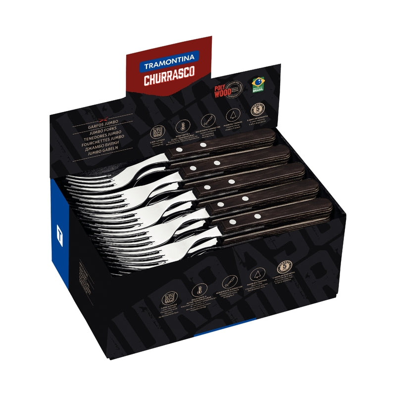 The Tramontina jumbo fork with stainless-steel tines and treated brown Polywood handle is a must-have item when serving the best barbecue. Perfect to serve at the table along with the tastiest meats, it ensures greater durability and resistance to weather and humidity. It features stainless-steel tines and a stylish brown Polywood handle. The perfect choice to guarantee the success of your barbecue!