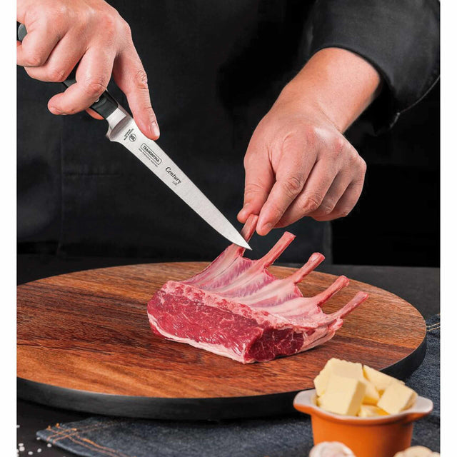 The Century Line knives have been especially designed for intense use. They receive a thermal treatment which consists of hardening (heating the blade), subzero (cooling from 50 to -196 degrees), and tempering (increasing the steel elasticity) for a longer and more efficient life. The anatomical and ergonomic handle offers safety during use. Made of polycarbonate and fiberglass, the handle is directly injected on the steel bolster and finalized with aluminum rivets. The Century Line has a 25-year warranty covering manufacturing faults and is certified by the NSF, National Sanitation Foundation, an organization internationally recognized by its consultancy, inspection, and training practices aimed at guaranteeing the sanitation of food, water, air, and the environment. The pieces are dishwasher safe.