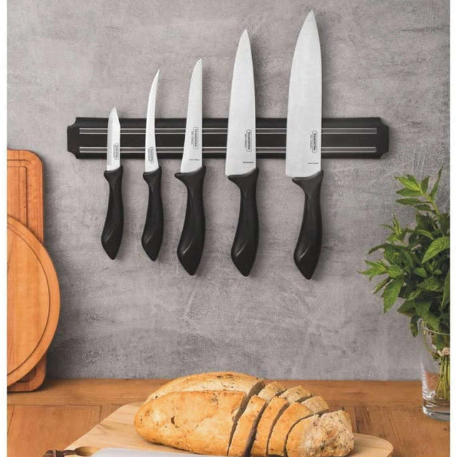 Your kitchen will be more beautiful and complete with the Tramontina Affilata 7-piece magnetic rack and knife set with stainless-steel blades and black polypropylene handles. It includes six knives for the most varied uses, perfect for fulfilling the needs of different food and recipes. The heat-treated stainless-steel blades ensure greater durability of the cutting edge and their black polypropylene handles provide greater resistance and durability. The set also includes a 38-centimeter magnetic rack for displaying the knives, giving the kitchen a more modern, more practical, and more organized look!