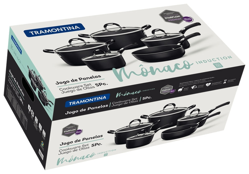 Take home the best that Tramontina has to offer with the Tramontina Mônaco Induction 5-piece black aluminum cookware set with interior and exterior Starflon Premium nonstick coating! Its pieces have a body made with special thickness aluminum and interior and exterior Starflon Premium nonstick coating, features that provide uniform cooking and prevent food from sticking to their surface. Its sauce pans and casserole come with tempered-glass lid with a steam vent and stainless-steel rim that help in food preparation and facilitate its viewing. Its metallic handles and knobs with silicone protection reduce heat propagation, providing a much safer and more comfortable handling. The perfect choice to change your kitchen routine!
