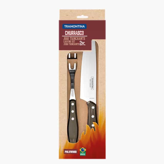 Your barbecue will be even better with Tramontina's 2-piece carving set with stainless-steel blades and treated Polywood brown handles. An ideal set from the Churrasco line for enthusiasts of good knives and good meats. The carving knife and fork have stainless steel blades. The knife has a high-quality cutting edge and the treated Polywood handles offer beauty and resistance to shock and high temperatures. This set will make the difference at your gatherings, adding convenience and perfect cutting performance.