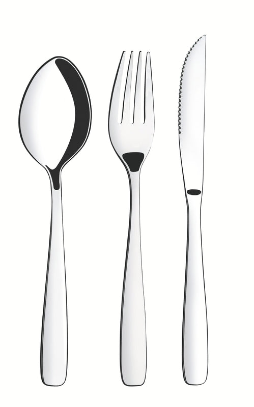 Stainless steel pieces, highly durable, maintains original features preserving the material's appearance, hygiene and durability. Spoons with symmetrical bowl and carefully rounded edges. Forks with internally polished tines, perfectly shaped for the mouth, and with round edges for more comfortable use. Knifes with fully tempered blades guarantees a more durable cutting edge, greater resistance to corrosion and will not scratch porcelain. High gloss finish. Suitable for daily use in any environment. Safe for daily use in the dishwasher.